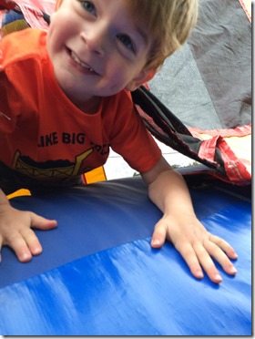 It wasn’t until most people had left that Rory wanted to go bounce. (After having a snack first, though.) It had stopped raining at this point, but it was still chilly. Rory didn’t care; he had a ball. Finally!