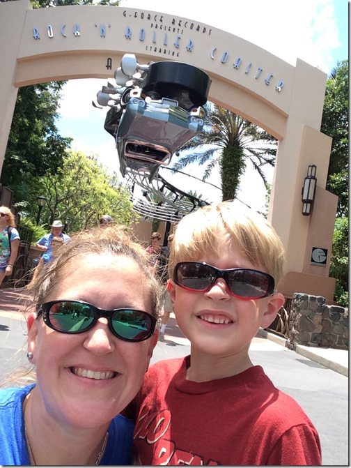 After conquering the tower, we went next door to my favorite ride in Disney: the Rock ‘n’ Roller Coaster. We didn’t have fast passes for this one, so we had to wait about an hour. Riley busied himself with watching Lego videos on my phone. When we finally got inside the building, I was amazed to see both boys’ names on two of the digital posters on the wall. Disney magic at work!