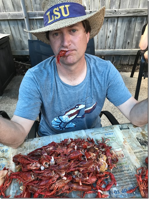 Kenny boiled 249 pounds of crawfish, which was our biggest amount ever. He had three pots going at once in an attempt to not be stuck cooking all day long. He sat down to eat a bit earlier than he usually does, but he unfortunately left out key ingredients in a couple of the batches because he was juggling so much. He did a great job, though; I’m always amazed at him on this day.